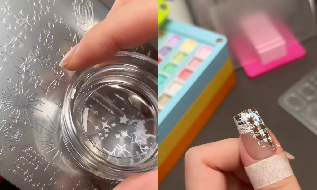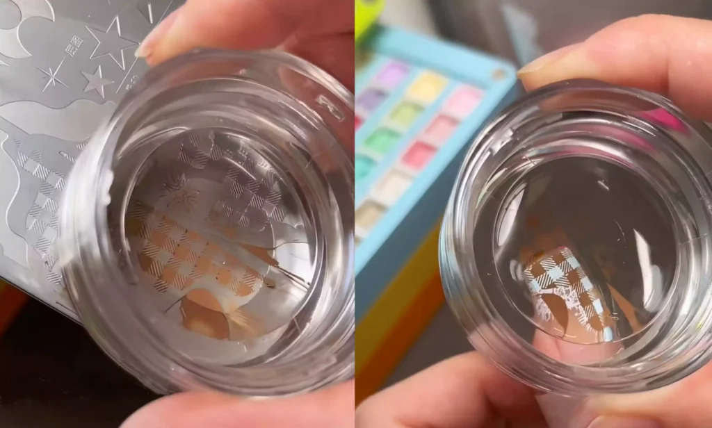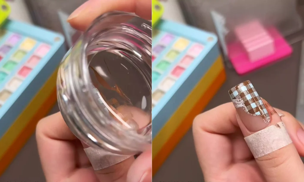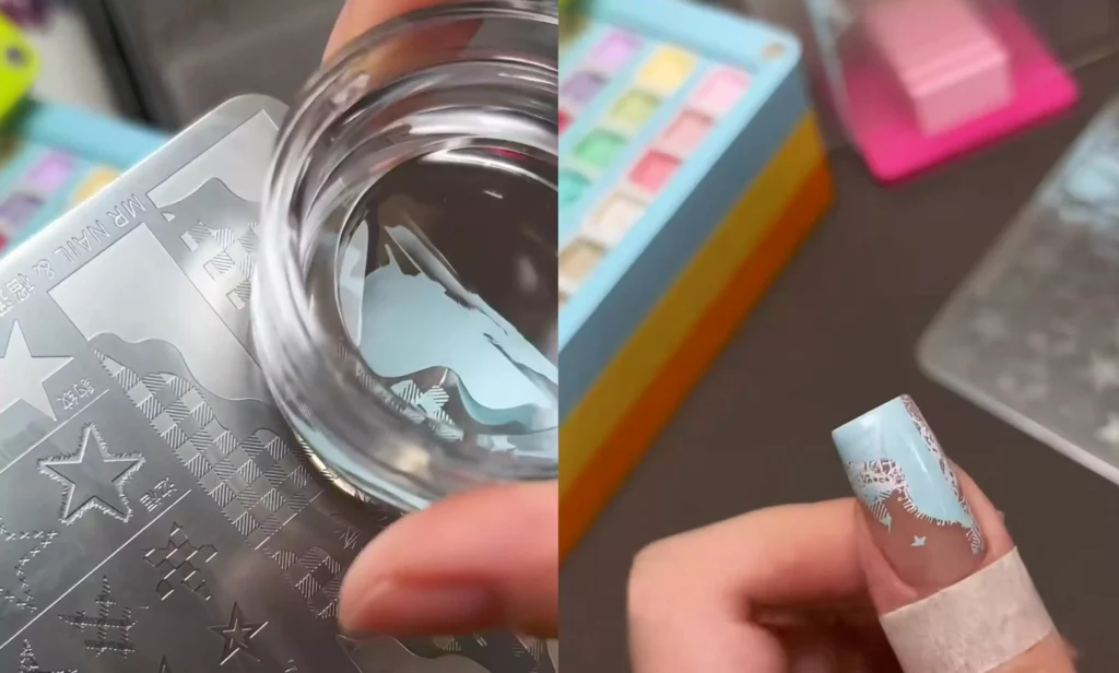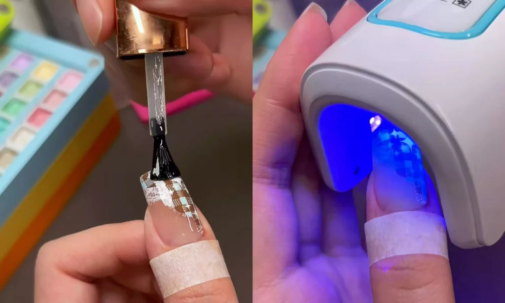 El dibujo se imprime en diagonal sobre la superficie de la uña y luego se limpia con un algodón.