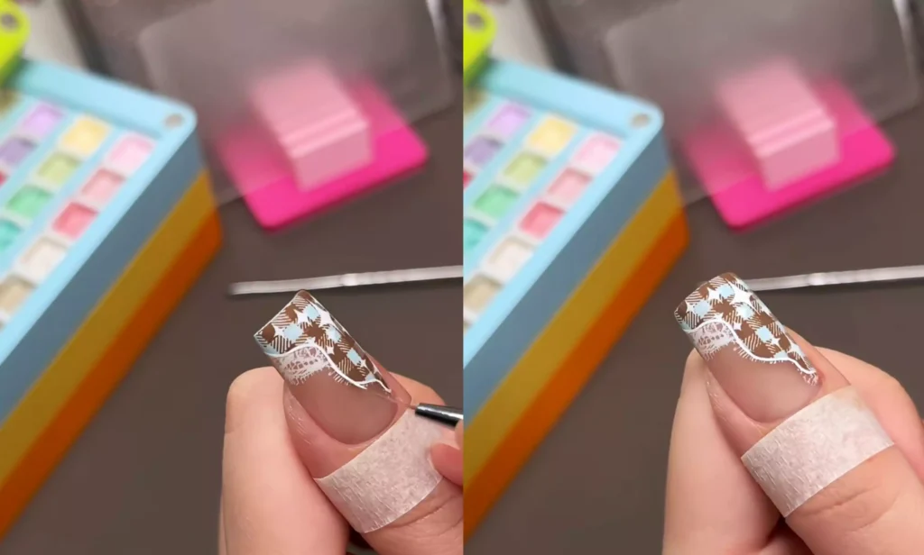- A continuación, aplica el estampado base a cuadros de transferencia azul. Para uñas más anchas, puedes pintar directamente el color y retocar los bordes para que el contorno a cuadros quede más definido.
