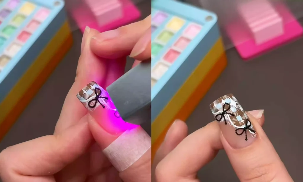 Por último, cura bajo la lámpara, ¡y tus esponjosas uñas con estampado de cuadros escoceses azules y marrones con un perfecto aire de otoño-invierno estarán completas!