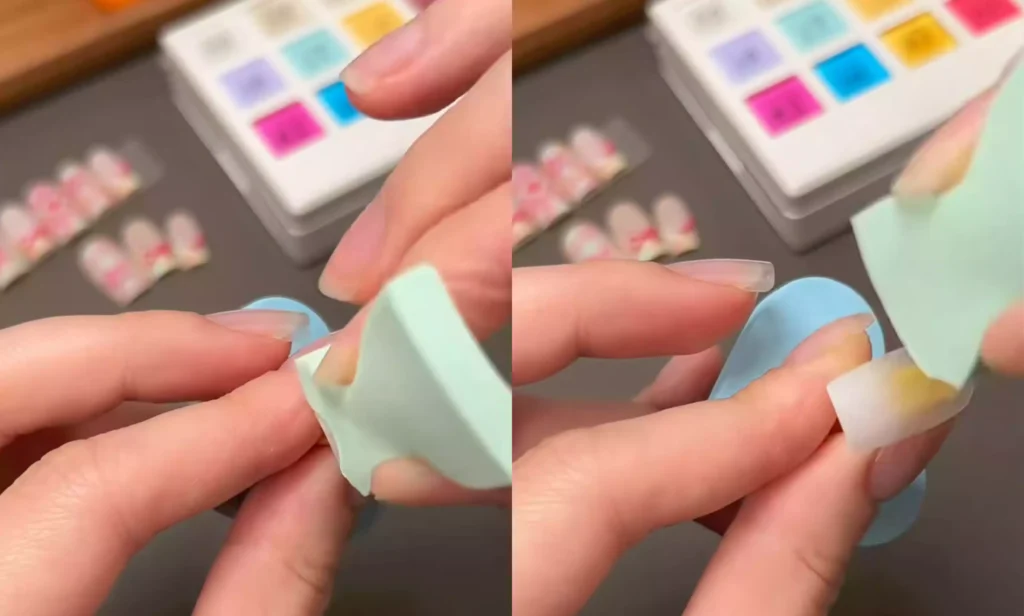 Commençons par appliquer la couleur de base. Prenez du vernis gel blanc et appliquez-le délicatement sur le bout de vos doigts à l'aide d'une éponge pour créer un effet dégradé. Cela permet de dissimuler habilement toute ligne de démarcation et de créer une base nette pour les travaux de nail art ultérieurs. Après avoir tamponné, faites durcir le vernis sous une lampe UV/LED.
