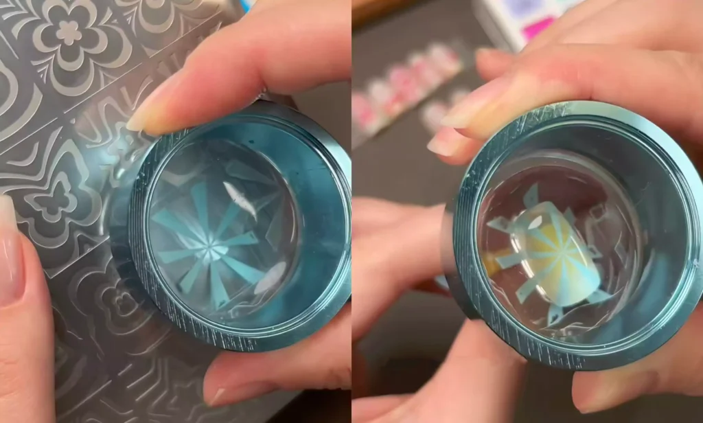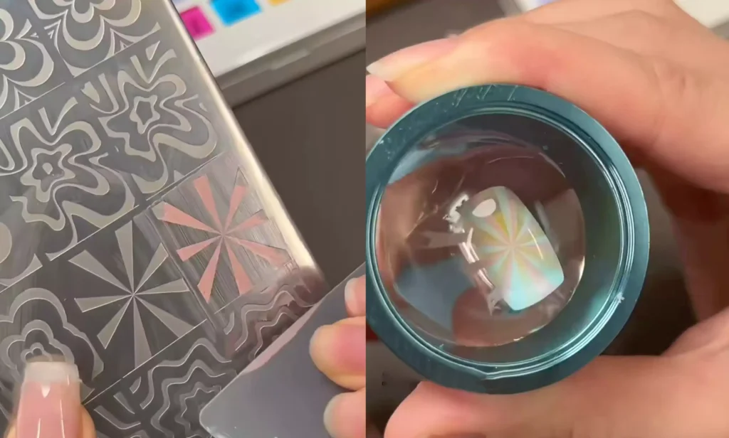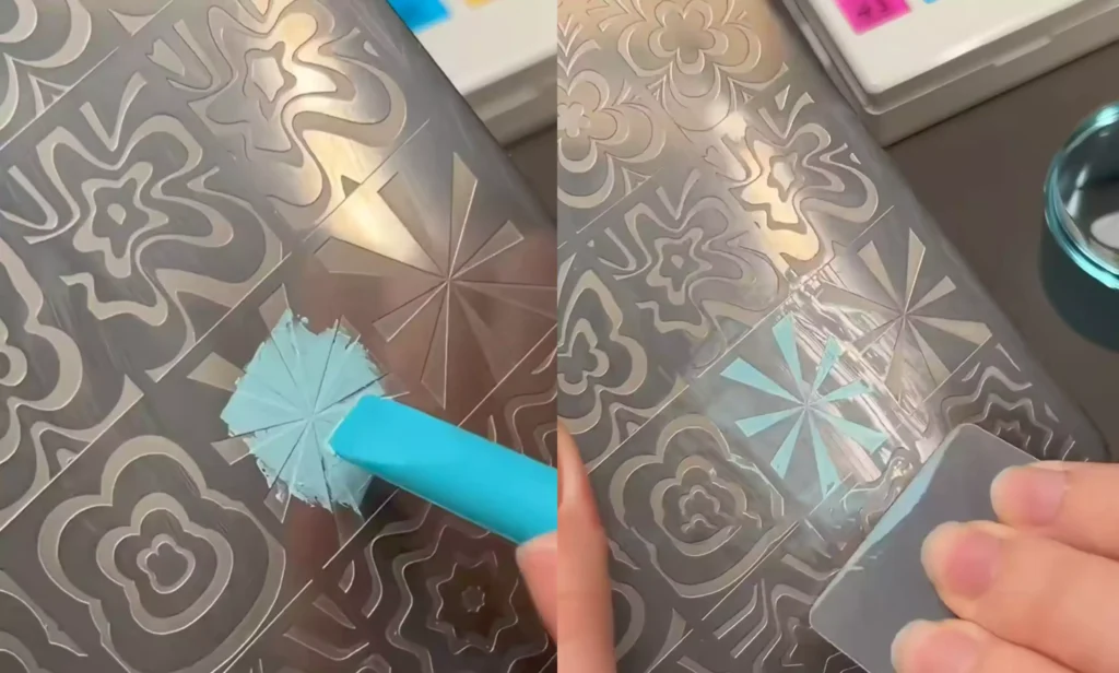 Une fois la couleur de base terminée, il est temps de procéder au transfert du motif. Sortez la plaque de transfert de nail art et le gel de transfert bleu.