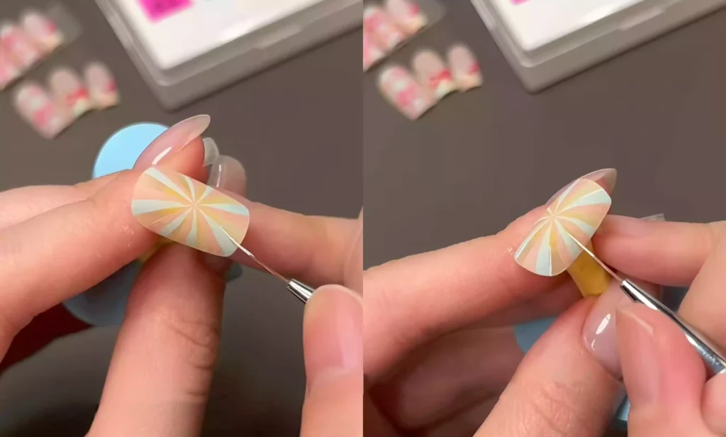 Ensuite, utilisez le gel blanc pour tracer délicatement quelques lignes avec des traits extrêmement fins. Ces lignes ressemblent à des traces de magie et enrichissent les détails du nail art. Après le tracé, durcir sous la lampe.