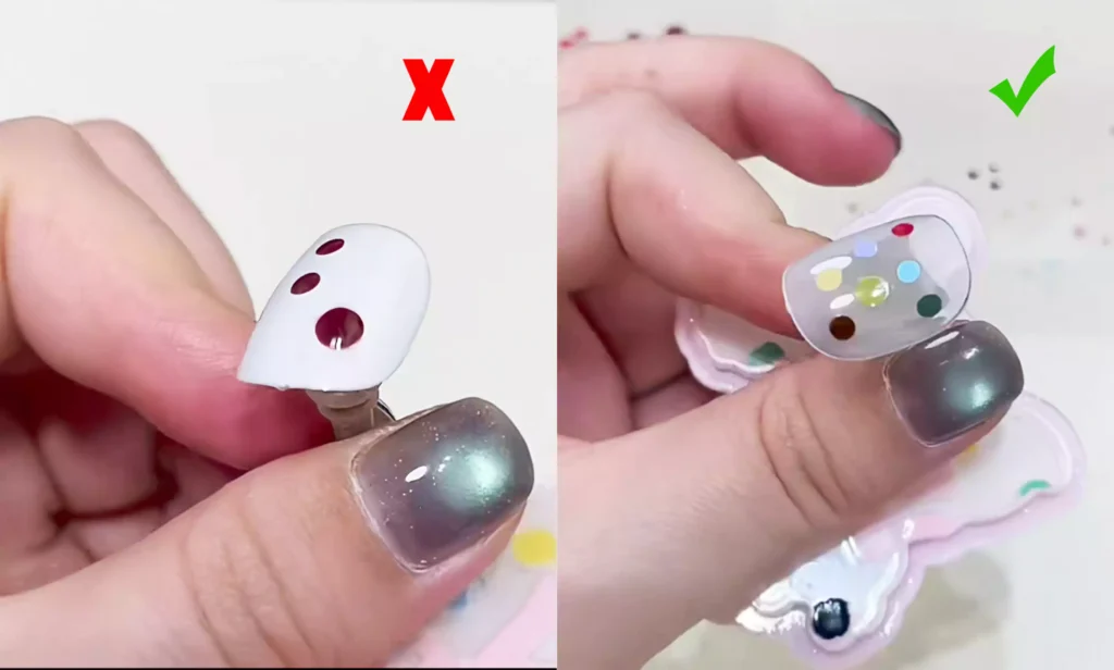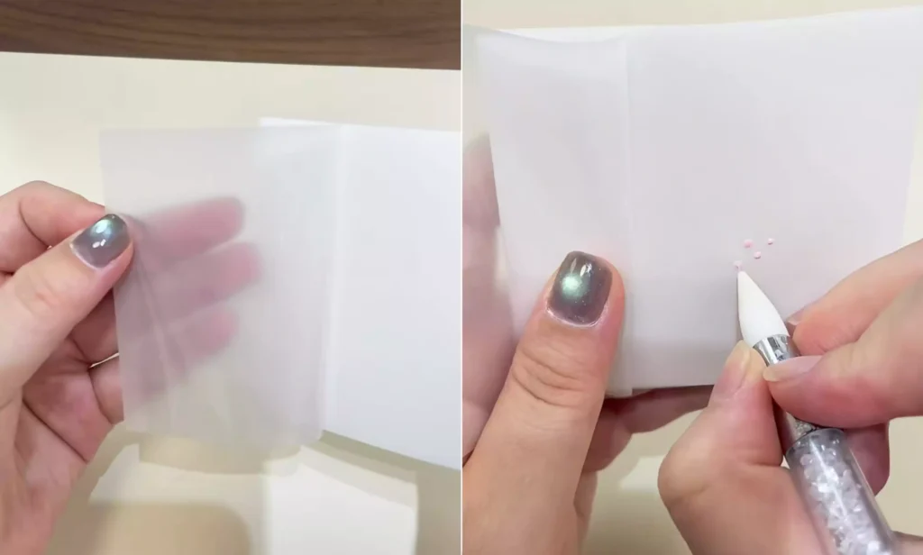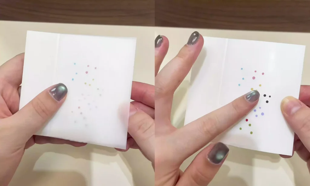 Step two: Lower the top layer of the sticker and gently press the polka dot area with your finger. Be mindful of the pressure applied—excessive force will thin the dots, making them difficult to remove from the sticker later.