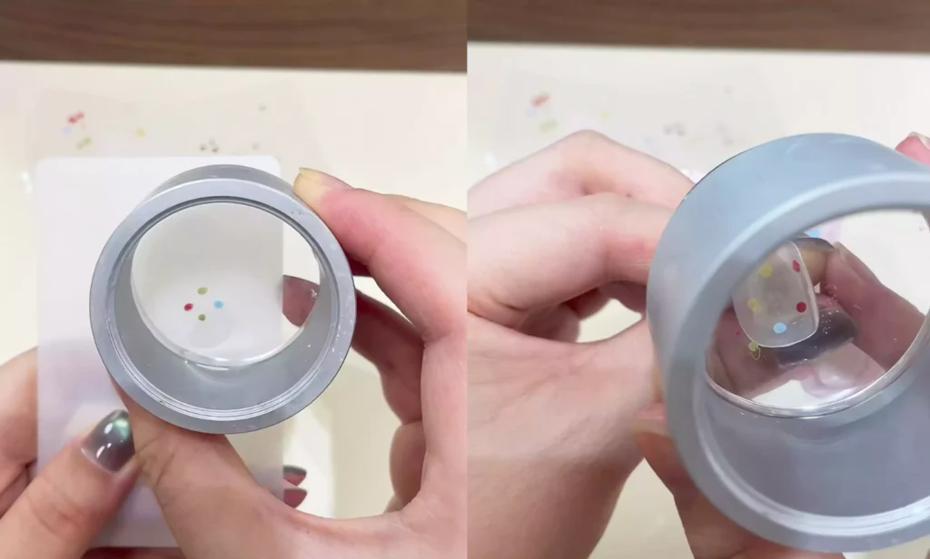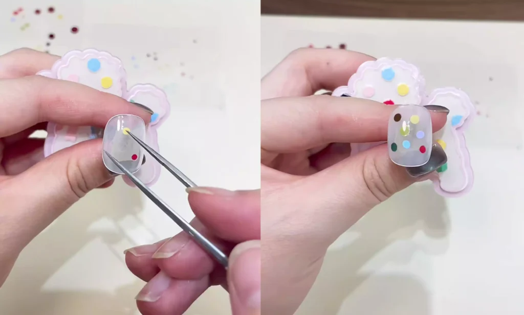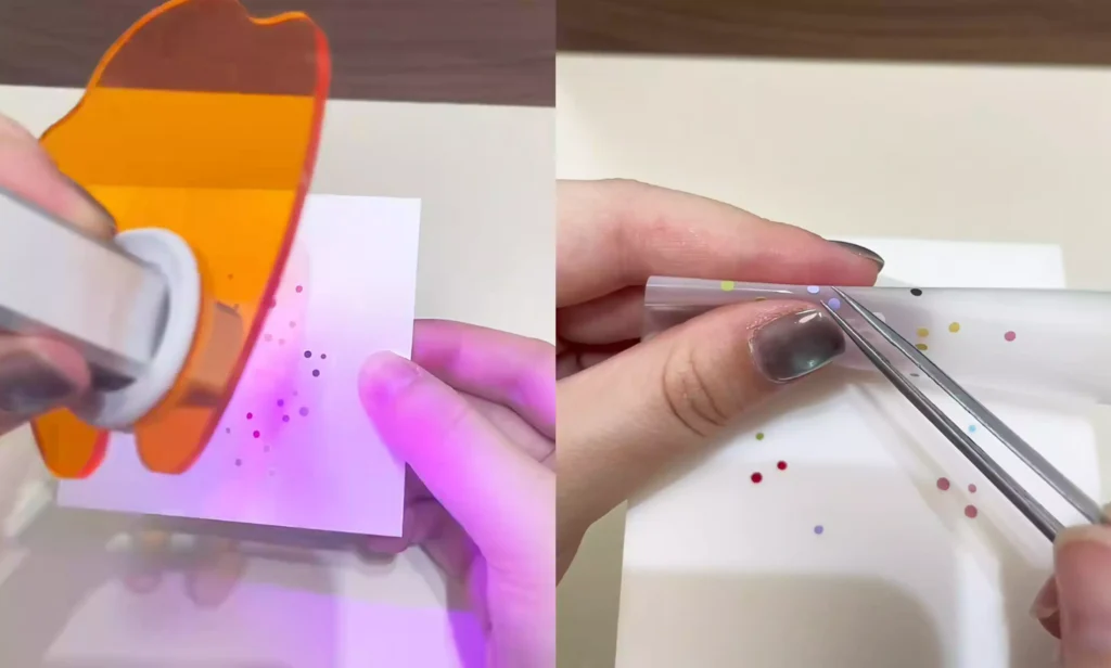 Step 3: Place the polka-dot sticker under the UV lamp to cure. Once cured, gently peel it off and use tweezers to easily remove the polka-dot sticker.